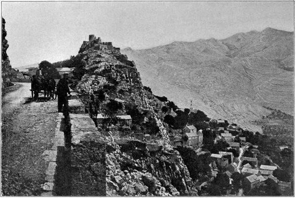 Arthur Evans, who has recently given back to us the palace of Minos, made in a series of essays some twenty-five years ago what French savants would call a “most penetrating study” of the roads and mines of Dalmatia and adjacent regions. Realizing from this book the importance of this great highway from Salona, and being already strongly lured by the sight of that great yawning gap in the mountain range, I took advantage of the fact that my appointment with Bulich was not until four o’clock to make the day a day of exploration. Taking an early start, I worked my way up to the top of the pass over a road laid out with such a gentle grade that I was able to bicycle over nine-tenths of the distance. Arrived at the top, I went on by a gentle down grade four or five miles into the interior toward Sinj; but, finding no commanding point of view, I returned to the top of the pass. From this point the view can hardly be overpraised. Exactly in the middle of the deep cut is Clissa, a sharp cone, on the truncated top of which is a strong fortress with a straggling village on the slope facing Spalato. Although there are no evident remains of masonry in the fort earlier than the mediæval period, there can be no doubt that a fortress primeval existed here. For once Baedeker deceived me in saying that admission to the fortress would be granted on presentation of a visiting card. The non-commissioned officer in charge stood by his guns, and, in spite of all importunity, refused admission except on the strength of a written permit from the commandant at Spalato. So I contented myself with a view from a point outside the walls some twenty feet lower down. Since it is mainly the view toward Spalato and the sea that is important, there was practically nothing lost. There was just a little feeling of defeat, of being baffled in an attempt to reach the highest height. A railroad is just now approaching completion from Spalato up through this gap to Sinj. When it is finished visitors can enjoy from its many windings all this fine view at their ease.