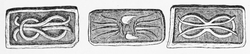 Superstition of the Greeks about saints’ days—Further engineering works—Narrow escape of six men—Ancient building on the western terrace—The ruins under this house—Old Trojan mode of building—Continued marks of higher civilization—Terra-cottas engraved with Aryan symbols: antelopes, a man in the attitude of prayer, flaming altars, hares—The symbol of the moon—Solar emblems, and rotating wheels—Remarks on former supposed inscriptions—Stone moulds for casting weapons and implements—Absence of cellars, and use of colossal jars in their stead—The quarry used for the Trojan buildings—“Un Médecin malgré lui.”—Blood-letting priest-doctors—Efficacy of sea-baths—Ingratitude of the peasants cured—Increasing heat | ||
