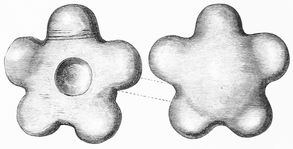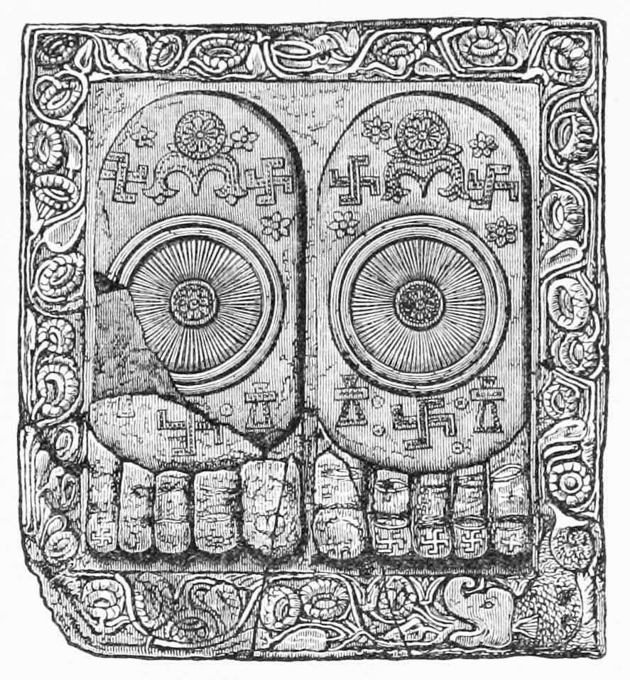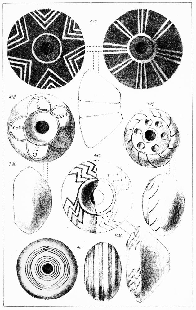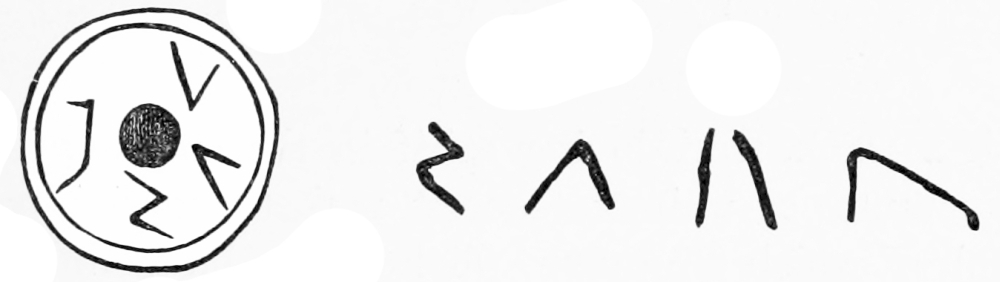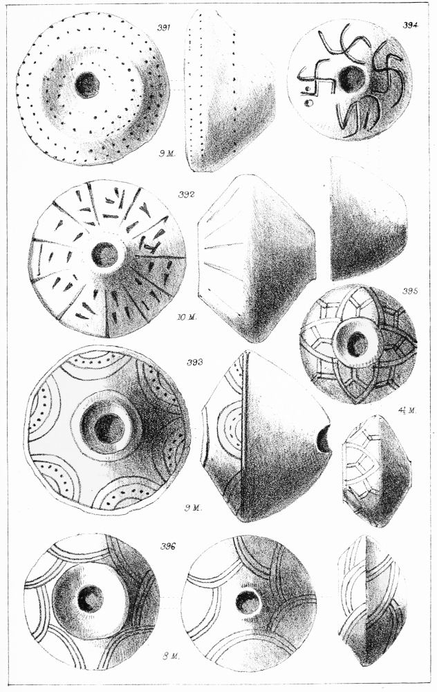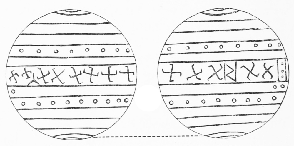 [321] The whorl on the left hand (the one discussed by Haug and Gomperz) is engraved from M. Burnouf’s more accurate drawing in our lithographed Plate LI., No. 496; the other is given at page 161; but they are repeated here (from Schliemann’s Atlas, Pl. 13, No. 432, Pl. 6, No. 208) in order to exhibit their identity. It is remarkable that these whorls, belonging to an age when writing was already known, are very coarse, both in material and work.