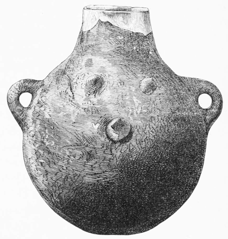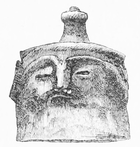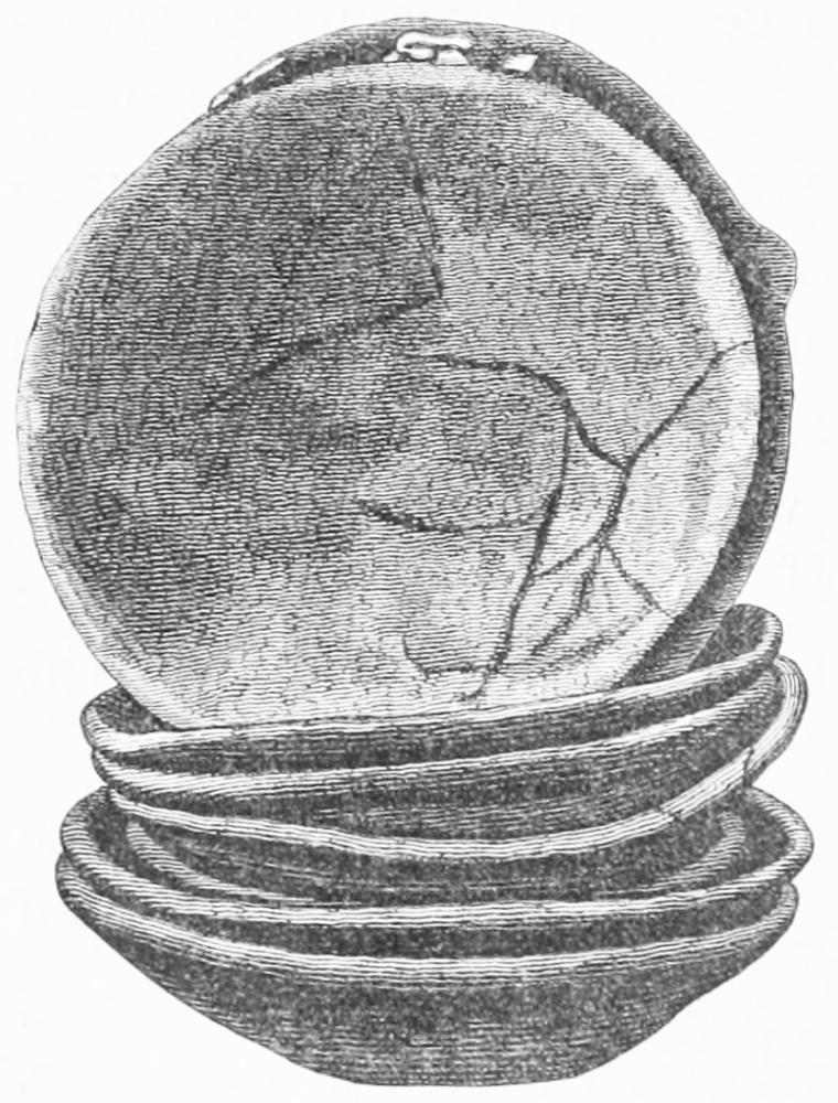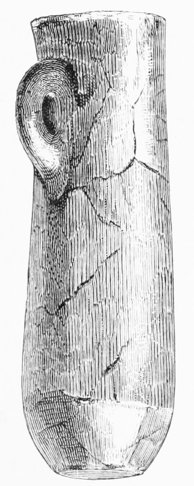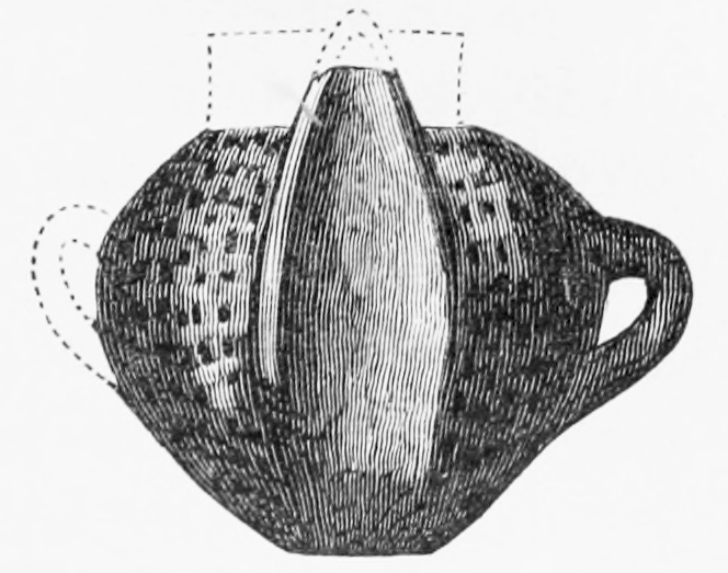 Another illustration is worth adding of the persistence of the forms of objects in common use in the same region. (See p. 47.) Mr. Davis, in his recently published travels in Asia Minor,[20] describes a wooden vessel for carrying water, which he saw at Hierapolis, in Phrygia, of the very same form as the crown-handled vase-covers of terra-cotta found in such numbers by Schliemann (see p. 25, 48, 86, 95, &c.). “They are made of a section of the pine: the inside is hollowed from below, and the bottom is closed by another piece of wood exactly fitted into it.” The two drawings given by Mr. Davis closely resemble our cut, No. 51, p. 86.