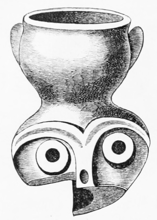 [262] In the letter-press to the Atlas of Photographs this object is described as “a brilliant dark-red Vase, 62 centimeters (above 2 feet) high, with the owl-face of Troy’s tutelar goddess, her two breasts, a necklace, and a royal scarf round the whole body. It is remarkable that this vase has not the two uplifted arms of the goddess, which are wanting in no other case, and that it has only two handles.”