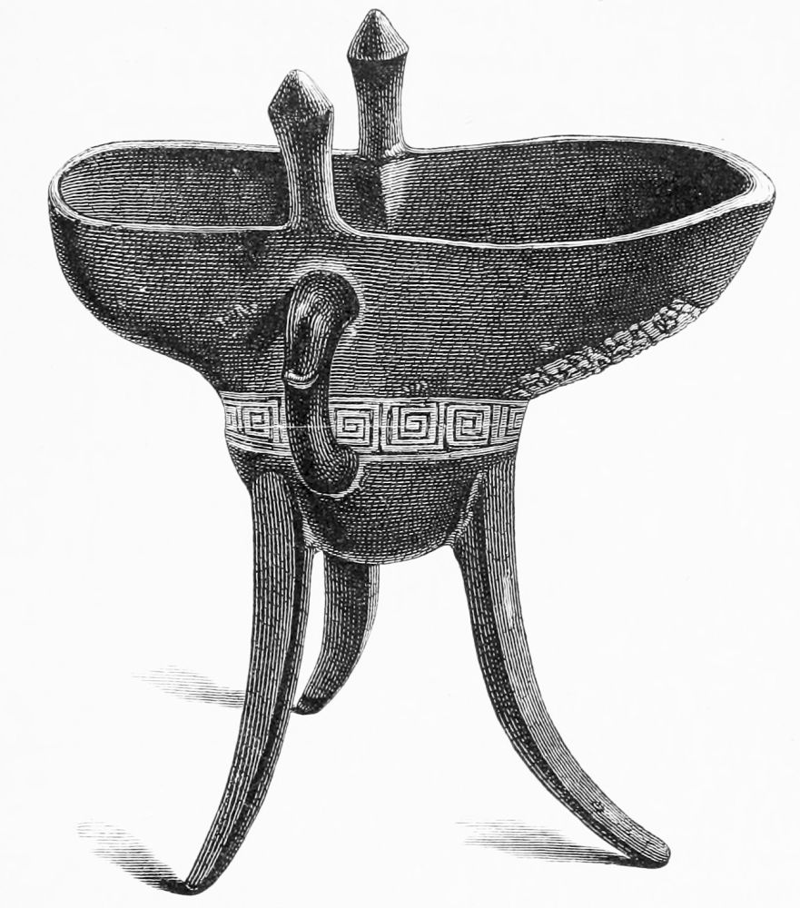 We are indebted to Mr. J. W. Lockhart for the following account of a double-spouted boat-shaped bronze vessel, used in a similar manner in the Chinese temples:—“In China there is a vessel of very nearly the same shape, but with ears prolonged till they rise an inch above the cup: the cup stands on three legs and is, in fact, a tripod. Such cups are used in the temples, especially in the ancestral temples of the real religion of China, when offerings are made to the manes of ancestors. The cups are filled with wine, when placed on the altar before the idol shrine, or before the ancestral tablet; and the wine is afterwards partly drunk and partly poured out as a libation.” Such vessels are used in pairs, and our drawing is made from one of a pair in Mr. Lockhart’s possession. It is of bronze, 6 inches long, and 6-1/2 inches high, including the legs. The width is 2 inches between the upright ears, and 2-3/8 inches at the broadest part. There is only one handle. Mr. Lockhart calls attention to the “key” ornament round the cup, which is so well known in the purest Greek art, as a sign of Chinese influence on the art of Western Asia and Europe. Mr. Lockhart also reads Chinese characters on some of the Trojan whorls. We are under a deep obligation to Mr. Lockhart for his spontaneous offer of this very interesting illustration of one of the most striking and (as we before supposed) unique objects discovered by Dr. Schliemann.—[Ed.]