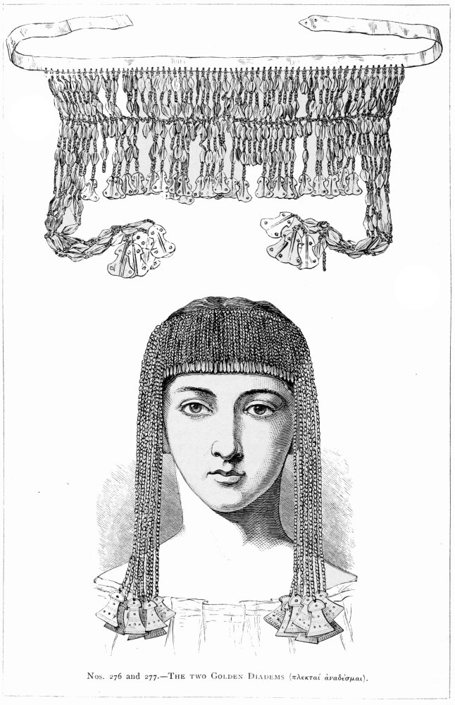 [292] The diadem discovered by Dr. Schliemann can scarcely have been the κρήδεμνον of Homer, which was a large veil or mantilla, such, for instance, as the sea-goddess Ino gives to Ulysses, to buoy him up on the water (Od. v. 346). This diadem would rather seem to be, as Mr. Gladstone has suggested, the πλεκτὴ ἀναδέσμη, which Andromache casts from her head in her mourning for Hector, where the order of the words implies that it was worn over the κρήδεμνον. Il. XXII. 469-471:—