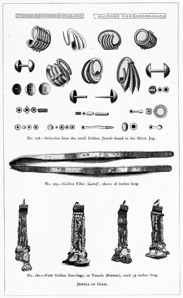 [294] See Plate XX., Nos. 279, 280, for a representation of the fillet and ear-rings. The four “ear-rings” remind us, both by their form and material, of the “beautifully twined tassels of solid gold” which fringed the Ægis of Athena: Iliad, II. 448, 449:—