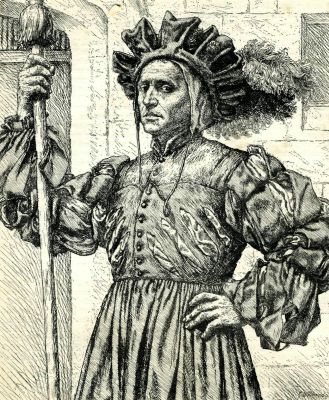 The queer-looking figure in the accompanying etching is that of a halberdier, or one of a style of soldier that formed an important body of the European armies of four hundred years ago. We of to-day would laugh at soldiers in such queer costumes; but in those days the halberdiers were considered a very fine-looking and handsomely uniformed body of men. The halberd, or half battle-axe, was a stout shaft of wood some six feet in length, and having a curious steel head formed for cutting, thrusting, or tearing; that is, one side of it was shaped like a battle-axe, and was for cutting; the end was like a spear; and on the other side was a strong hook, which was very useful in tearing down outworks.