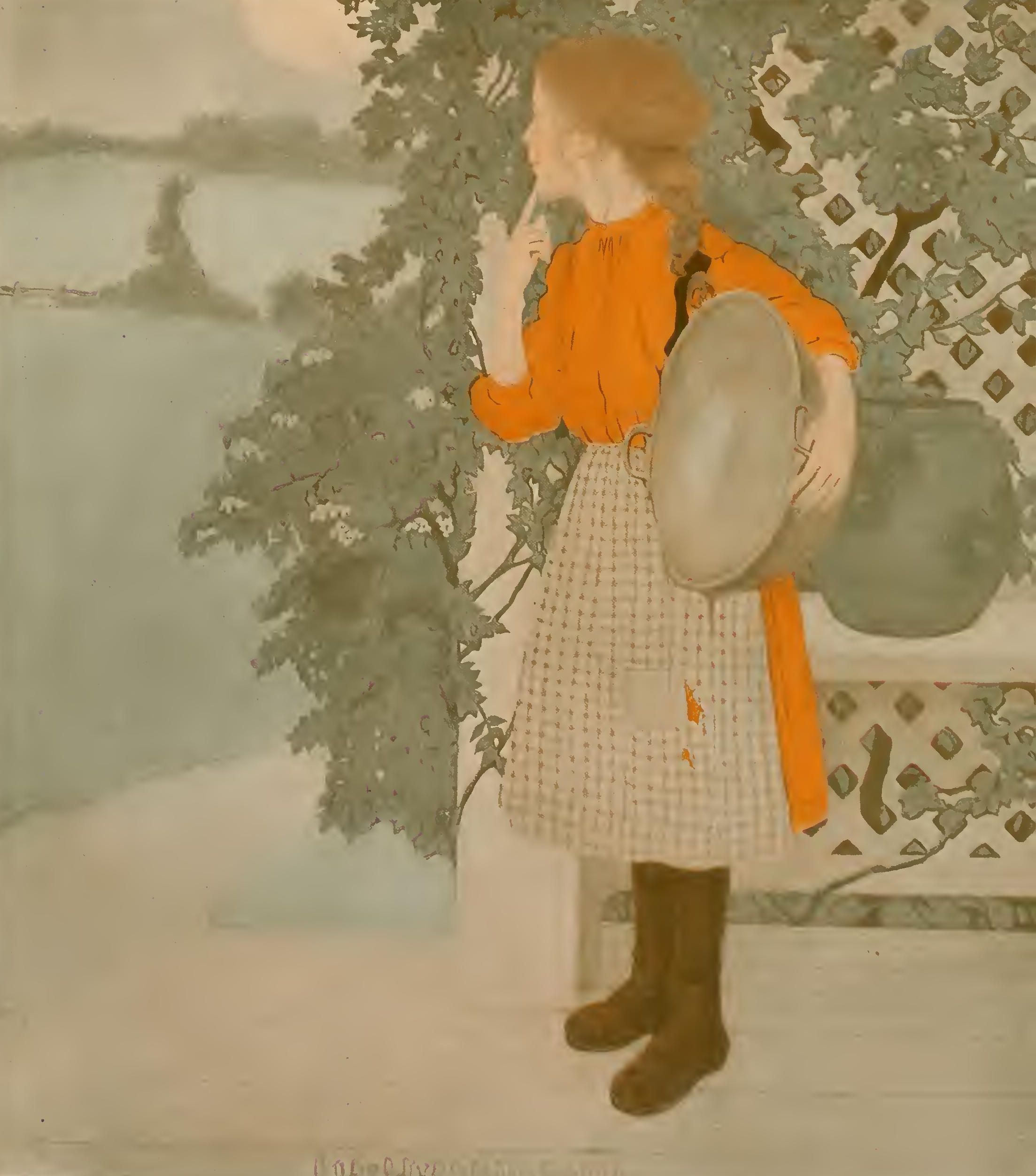 An' shoo the chickens off the porch, an' dust the hearth, an' sweep,