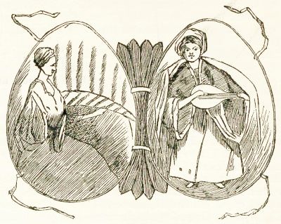 Sometimes the surface of the egg is divided into spaces, to be filled up according to the taste and skill of the designer. One may contain the name and age, another a landscape, the third a good wish, the fourth, if you have so divided it, a likeness or flower. In some parts of England eggs simply dyed and dotted with tallow are presented to the Junior Class at college, and in Germany they have a way of adorning eggs with foliage, all in transparent work, which is cut out with aqua fortis. In Rome, the Easter-eggs are carried to the parish priest, who blesses them, and sprinkles them with holy water, and on Easter-day at dinner the cloth is adorned with sweet herbs and flowers, and the first thing eaten are the blessed eggs; they are painted by the nuns, and sold in the streets.