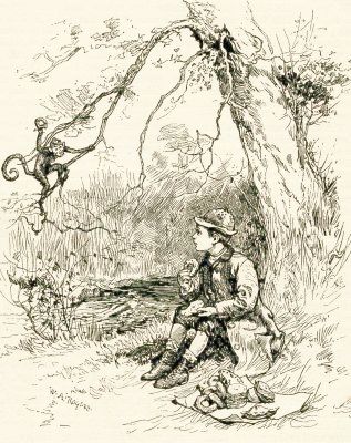 Toby's first act was to wash his face, and he tried to make the monkey do the same; but Mr. Stubbs had no idea of doing any such foolish thing. He would come down close to the edge of the water, and look in; but the moment that Toby tried to make him go in, he would rush back among the trees, climb out on some slender bough, and then swing himself down by his tail, and chatter away as if making sport of his young master for thinking that he would be so foolish as to soil his face with water.