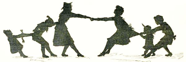 One may often see in our city streets a group of children, two standing with uplifted hands while the others pass between, and chanting, in a tune of their own, the foregoing words. At the conclusion the hands are dropped around a comrade, and he is asked to choose between the two leaders, who have decided upon names—as, "a gold church," and "a silver castle"—and placed behind his choice. At last all are caught. Then comes the "tug," often a very unequal and amusing contest.