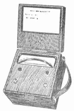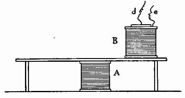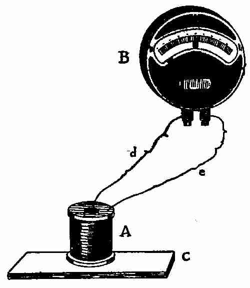 [18]I then fastened one of the coils upon the table underneath a small bench (Fig. 4) and sent an electric current around it. The other coil, B, connected with the ammeter was pushed back and forth along the surface of the bench over this coil. The boys found that the more electric current I sent around the coil A, that is, the stronger I made the magnetic field, the harder it was to move the coil B. They found that the nearer B was to A the harder it was to move it. They found that the faster they moved B the more electricity was produced. They tried laying B upon its side upon the bench and thus moving it. They tried taking B off the bench and moving it on all sides of A. They found it much harder to move in some ways[19] than in others, but in all cases they found that the harder they had to work the more electricity was developed, as was shown by the ammeter.