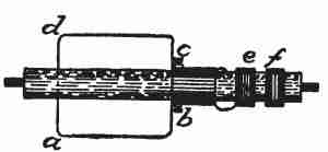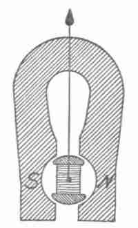 I opened and closed the switch, which sent the electric current through my magnet coils at frequent intervals, and the two boys, each with a compass needle, searched the field for magnetic effects. They found that the magnetic field extended six or eight feet, but this piece of research was broken up by a new idea which appeared to strike them both at the same instant, for they shouted both together,[17] "Let's use this electro-magnet in place of the bar magnet for our dynamo experiment!"