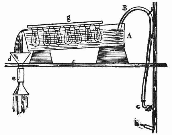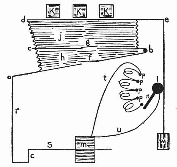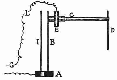 Strips of brass and iron, B and I (Fig. 177), were riveted together. These were fastened in the socket A. They are shown edgewise in the diagram. The upper end of this compound strip is free to bend back and forth in the plane of the paper, as here represented. They normally touch the screw C. One of the electric light wires runs from the lamps in the oven to this screw C. One wire of the dynamo circuit G goes to the lamps, and the[307] other connects with A. Thus the compound strip acts as a switch to open and close the circuit upon the lamps.