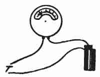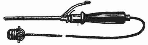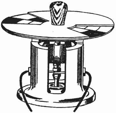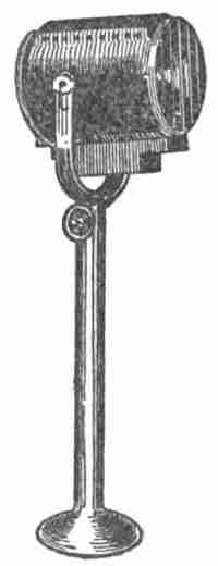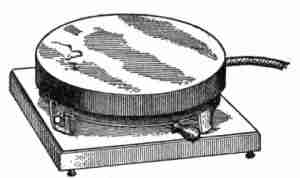 To emphasize the fact that the dynamo had lighted the lamp, rung the bell and made the telephone receiver hum without being connected with them, I repeated all these experiments in a different way. Spool A, connected as before with the electric lighting circuit, was concealed beneath the table. For spool B I substituted spool C (Fig. 199), on which the wire was wound so as to appear like a candlestick. On the top of this was placed the miniature electric lamp screwed into a miniature socket and[352] connected to the wires of the spool. This "Witches' Candle," as we called it, was sitting unlighted upon the table when I called attention to the fact that if I moved it to a certain spot upon the table it flashed into full light. (Of course this spot was directly over spool A.) I moved it slowly away from that spot and its light slowly grew dim and disappeared.