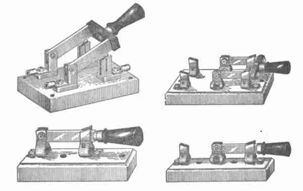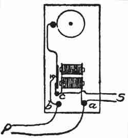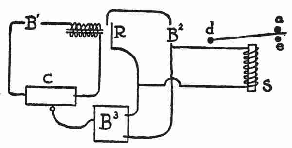 Our next addition was a telegraph sounder as shown in Fig. 195. B1 is a single dry cell, C is the coherer, R is the relay, B2 is now a battery [330]of three cells. Part of its current goes to B3, the tapper for the coherer, and part of its current goes to the electro-magnet of the telegraph sounder S. Ordinarily a spring holds the iron strip d up against the metal stop a, but when the current passes through the electro-magnet it pulls down this iron strip with a click against the metal stop e. But while this is happening C is being tapped by B, and is ready to respond to each wave. It was only necessary now to have some code of signals in order to communicate by telegrams. We learned the system of dots and dashes, or short and long periods marked off by the sounder, which all telegraphers use and which is known as the Morse alphabet, and very soon Harold and I were telegraphing from one room to another messages of several sentences at a time, the Morse alphabet[331] being told off on the spark coil and being received through the coherer and telegraph sounder. It was not long before Harold and one of the neighbours' boys were exchanging messages between their homes, each having a spark coil and the necessary receiving apparatus, and having extended their antennæ to the top of the buildings into what are called in the wireless language aerials.