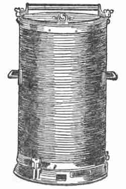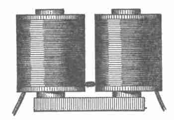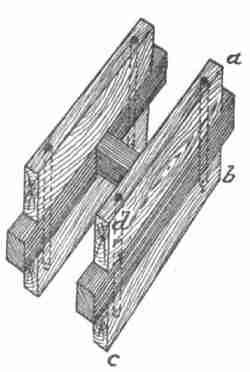 "Joseph Henry, while teaching in the Albany Academy, was the first to make electro-magnets. There was no such thing as wire covered with an insulating material then in the market, and he wound[15] all his wire with silk ribbon. But in the year 1834 he made magnets which lifted thirty-five hundred pounds, to the astonishment of every one. A pair of such electro-magnets as I have here (Fig. 3), each consisting of one pound of No. 24 cotton covered copper wire, eight hundred feet long, wound in one thousand turns about an iron core two inches in diameter, will lift several hundred pounds: much more than we three can lift, as I shall now show you."