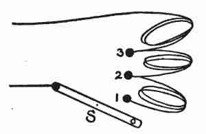 "Magnetism is not confined to the magnet. It extends more or less widely into the region about it. It is this region affected by the magnet that we designate its magnetic field. By bringing this sensitive compass needle into the region of this bar magnet from all directions, I show you that it has a slight power to change the direction of the needle when about a foot away. This power grows rapidly greater as the distance grows less. Of course its field extends rather indefinitely, but we may say that this particular magnet has an appreciable field extending about one foot in all directions from it. We find upon examination that some magnets have bigger and stronger fields than others, that all have their strongest fields when first magnetized and lose their strength gradually, but never entirely. We find that hardened iron and steel hold magnetism longer than soft iron, but all iron is magnetized somewhat at all times. Iron that is feebly magnetized can be made into a strong magnet by bringing it into a strong magnetic field.[14] The earth is a feeble magnet, and that is why it gives direction to the compass needle. That is also probably the reason why every piece of iron upon the earth is a magnet, or, to put the cause back another step, we may say that whatever causes the earth to be a magnet also causes every piece of iron upon the earth to be likewise a magnet.