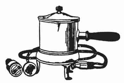 Before a mixture of gasolene vapour and air can be ignited its temperature must be raised to about 2000 degrees Fahrenheit. I will show that heat waves pass out from this spark gap by placing my watch crystal filled with gasolene underneath the knobs of the spark coil, (Fig. 181). When now I close the electric circuit at the battery the mixture of gasolene vapour and air just above the watch crystal is ignited. If I increase the distance between the knobs you still hear the crackle of the sound waves and see the light waves, but the mixture of gasolene vapour and air does not ignite, because there are not heat waves enough. The automobilist expresses this fact by saying a "fat" spark or a "warm" spark is needed. A battery which has ceased to give a sufficiently hot spark to explode the mixture of gasolene and air in the cylinder of a gasolene engine may serve all other[314] purposes quite as well as ever. It may ring bells almost as long as it ever would.