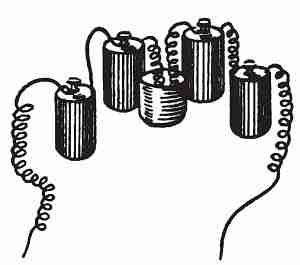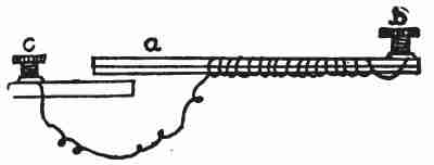 In my first experiment on that occasion I took a one-pound spool of No. 24 cotton-covered copper[350] wire and crowded the hole in the spool full of wire nails A (Fig. 198). I disconnected the wires from an electric drop lamp and connected them to b and c, the ends of the wire from the spool. Our electric lighting circuit was what is called the alternating current. I also had a second spool, B, precisely like the first. The wires from this were connected to a miniature lamp, L, such as is used at the switchboard of a telephone exchange. We then screwed the drop-light plug into the chandelier and turned on the electric current. I brought spool B with the miniature lamp near to spool A, as shown in Fig. 199, and when it was within a distance of about two inches the little lamp lighted up to full brilliancy, thus showing that while the electric current is passing in the wire of spool A its influence is not confined to the wire, but exhibits itself in the region outside of the wire. To illustrate still further this fact we substituted an electric bell in the place of the lamp L, and when the spool B was brought near to A the bell rang. But the most striking illustration was obtained when a telephone receiver was put in the place of L. With this held to the ear while the spool B was brought toward A a humming sound could be heard when B was about a foot distant from A. This sound grew rapidly[351] louder as B approached A, until, when the spool B rested upon the spool A, a sound like the peal of a pipe organ was heard all over the apartment. The tone was very nearly that of the key on the piano which is two octaves below middle C. I unscrewed the cap on the large end of the telephone receiver, took it off, and moved the thin iron diaphragm to one side, when it began to dance about at great speed. It was keeping time with the dynamo, five miles away, which generated the electric current. The dynamo changed the direction of the electric current sixty times per second, and this made sixty vibrations per second. The dynamo sent out ether waves which affected the telephone receiver, although the receiver was not connected to the dynamo by wires.