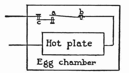 The electric spark which occurs when the thermostat breaks contact with C causes the metals to corrode at that point, and corroded metals are poor conductors. This corrosion is due to the oxygen of the air. There is one metal—the expensive platinum—which is not corroded by the electric spark. We drilled small holes in the end of the screw C and in the brass strip and pounded into these holes little pieces of platinum wire. Harold said he felt like a dentist filling a tooth. This furnished good, clean contact at all times.
