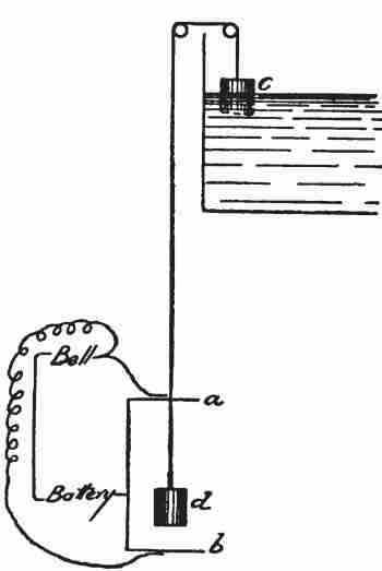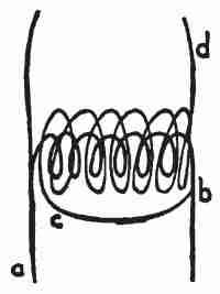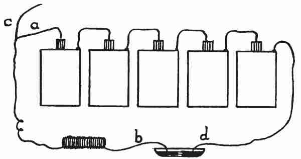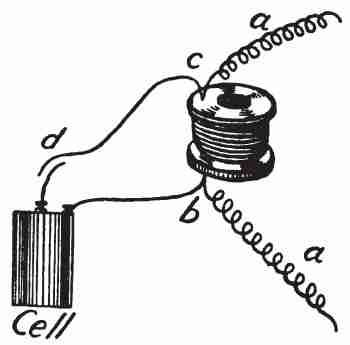 We constructed a simple spark coil as follows: We bought a pound of No. 24 single cotton covered copper wire, such as is used in the electro-magnets of bells. It was, when we bought it, wound upon[322] a wooden spool. We filled the hole in the centre of this spool with wire nails. One dry cell was connected with this (Fig. 187). When the wires at d were touched together, and then separated, a spark was produced at that point. A ground wire was connected at b, and an antenna at c, as before. Using this apparatus now as a transmitter of ether waves, we found that the coherer detected them.