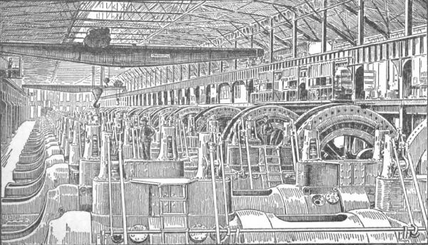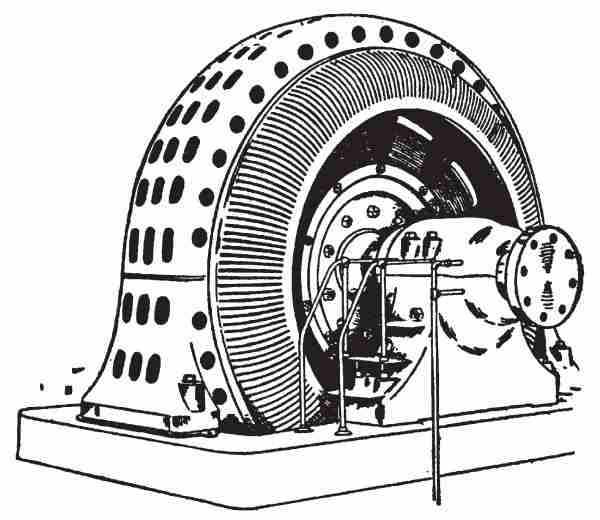 "Each one of these dynamos has many hundred tons of iron in it. A huge wheel of iron, thirty-two feet in diameter, one hundred feet in circumference, portions of which are surrounded by insulated copper conductors, forms the centre-piece of the machine. This movable part weighs four hundred tons. Around about this is a fixed ring of iron, portions of which are surrounded by insulated copper conductors. Ordinarily the ring which is stationary is called 'the field,' and the wheel, which rotates, is called 'the armature,' although these terms are sometimes reversed for certain reasons. The movable part in these machines rotates about once a second, that is, its circumference moves a little faster than a mile a minute. The iron moving at this high rate of speed creates ether streams or electric currents, which are led off by the copper conductors.[10] The generation of electricity on a large scale requires large masses of iron and high velocity."