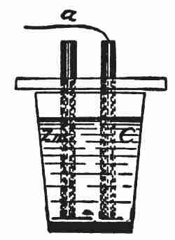 We thrust one of the wires into the tube, then mixed equal parts of the silver and nickel filings and put as much of the mixture into the tube as we could hold upon the tip of a penknife blade, and then thrust in the other copper wire. (See Fig. 182.) The ends of the wire were about one eighth of an inch apart and the gap was loosely filled with the metal filings. This was connected by short pieces of copper wire, as shown in Fig. 183, to a dry battery cell, B, and a sensitive ammeter. When all connections were made the needle of the ammeter remained at zero, showing that no electric current was passing,[318] that is, the battery cell was unable to send any electricity through the metal filings.