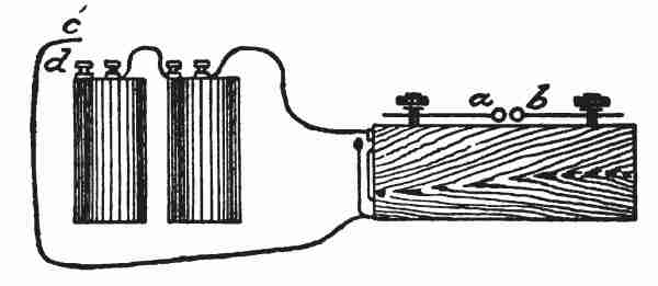 When the evening came I showed the boys an automobile spark coil to which I had attached two knobs, a and b (Fig. 179), and with which I had connected two dry battery cells. When I touch the wire c to the binding post d a spark passes between the knobs a and b. When this spark occurs at least four kinds of waves pass out in all directions from the spark gap between the knobs.