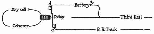Harold was to have a birthday party, to which many of his school friends were invited. For this occasion he prepared, with my help, to perform for the girls and boys some electrical experiments, and particularly to give all who chose to try it an electric shock. For this purpose he had them all join hands, and the electric charge was sent through the whole line at once. One thing he did shocked his mother more than anything else. He instituted a mock court, at which one of the boys was tried, convicted and condemned to be executed by electricity. The whole affair was enacted with no great solemnity, but the electrical experiment was voted a great success by the executed "criminal." The following group of experiments, however, seemed to give the most satisfaction: On a table was placed the coherer connected to the relay, and in another room was placed the spark coil for sending ether waves.[325] He had this operated by a confederate whom he chose for the purpose. He then connected two wires to the relay, one at d and the other at e (Fig. 189). These ran to a battery cell and a bell in a far corner of the room. At a given signal (a cough) the confederate made a spark at the spark coil in the other room; this sent ether waves through the partition between the rooms; the ether waves caused the coherer to pass electricity from the dry cell No. 1, to close the relay spring R. This acted like a switch to close the second circuit through the dry cell No. 2 and the bell, which rang out to the surprise of all. It continued to ring until he tapped the coherer tube and broke apart the filings. When this had been tried to the satisfaction of all, the company was invited to another room. Here they found an electric train with tracks, train sheds, stations, tunnels, bridges, switches, signals, etc., arranged upon a centre table. The electric train was to be started by ether waves. A wire from the railroad track was connected with e of the relay[326] (See Fig. 190). A wire from d of the relay was connected to the third rail through a battery of sufficient strength (Battery 2). The electric train completed the circuit by connecting the tracks with the third rail. All heard the crack of the spark coil in the adjoining room, and saw the train start immediately. Ether waves had caused battery 1 to close the relay R. This had closed the circuit so that battery 2 might run the train, of course by means of a motor in the train. He tapped the coherer. The relay spring R flew open and the train stopped. Presently another crack from the adjoining room, and the train instantly started again. When all the details of the electric train had been examined the company was invited to go to the dining room, which was dimly lighted by candles. All were seated and busily conversing when the crackling noise of the spark coil was again heard, and a group of little electric lights flashed forth upon a birthday cake. The wires from the lamps and a battery to run them[327] had been connected with the binding posts d and e of the relay.