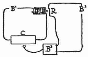 The next time Harold and I experimented we arranged something to save us the trouble of tapping the coherer each time we used it. We employed simply an electric bell, B (Fig. 194), from which we removed the gong. By reference to the figure the arrangement will be understood. Each time ether waves cause the metal filings to cohere and the battery B1 closes the relay R, battery B2 causes the hammer of B3 to tap against the coherer. This causes the current to cease to flow from B1 and the relay opens again by its own spring.