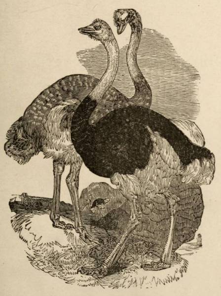 A full grown ostrich will weigh about three hundred pounds, and stands about seven to eight feet in height. In the breeding season they will travel in broods of from three to five in number, one of which is invariably a male. The hens lay their eggs in a pit scraped out with their feet, the sand forming a ridge around it. When they have accumulated a dozen eggs or so the male begins to brood, always taking his place on them at night, surrounded by the hens, while by day they will relieve one another. Again, at times the hatching has been left entirely to the sun. North African eggs present a smooth surface, while those of the South are pitted.