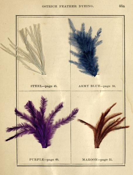 The manufacturers of America could have been counted on the fingers of one's hand a dozen years ago. At the present time New York alone can boast of between forty and fifty. Enterprising men in other cities and throughout the country are yearly becoming interested and endeavoring to take hold of this young and profitable business, and we can look to ostrich feather manufacturing at the present time as one of our staple industries. The greatest disadvantage manufacturers have had to contend with was a lack of knowledge of coloring. Our greatest chemists and aniline manufacturers[2] have worked diligently, contributing largely to the progress of wool, cotton and silk dyeing, but the amount of dyestuffs used by the largest feather manufacturers was of such minor importance that it did not seem profitable for them to investigate; consequently the art of ostrich feather dyeing progressed very slowly. Feather dyers a dozen years ago were scarce, and the art (if in those days it could be called such), was controlled to a great extent by the French, who, judging by my experience with them, impressed me as being the most egotistical mortals, and decidedly orthodox in their methods, absolutely refusing to take hold of anything new that might prove beneficial to them, and so jealously did they guard their (as they considered them) secrets, that during working hours every one of them even their employers, were denied admittance to the dye-house.