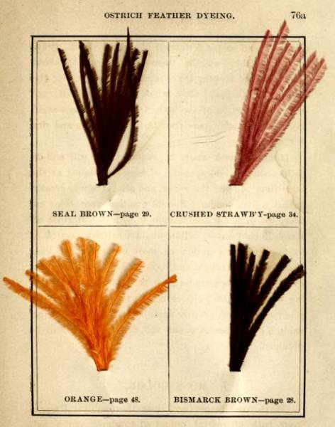 Bismarck brown is a product that is used in feather dyeing to a considerable extent, chiefly in a diluted form. It dissolves readily in boiling water. It comes in the form of a powder, of a dirty black hue, and in liquid it is a heavy yellowish red. It makes a fast color, alkali having but little effect on it. Oxalic or sulphuric acid will brighten the color, and turning it more on the red order. In giving a brownish hue to such light colors as beige, ecru, etc., it is invaluable. It is used by some in the topping of dark brown. It has such a great affinity for the fibre of feathers that it is very difficult to remove therefrom.