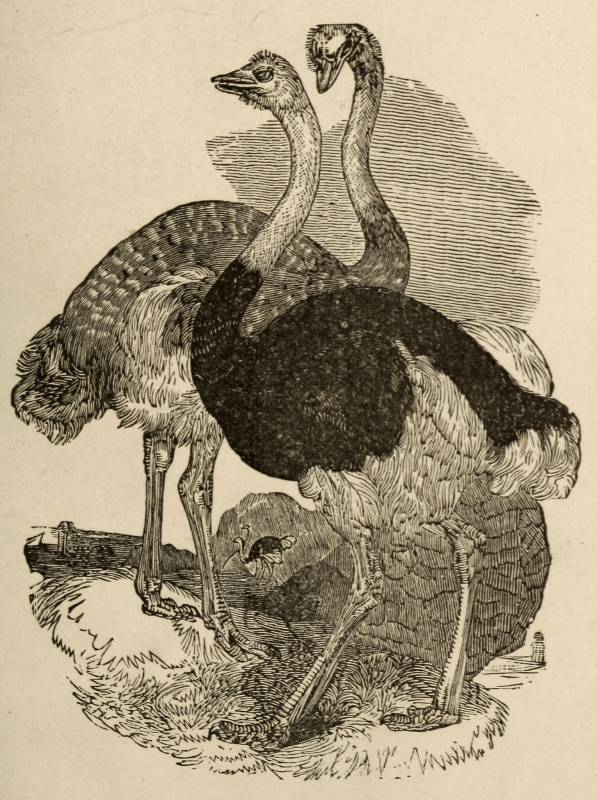 At the present time an ostrich farm is in progress in California; it is as yet a very young institution, and its[5] success is being watched with interest, but, in my opinion, while the bird will live and thrive, the quality of the plumage will be very inferior to those in their native clime. So much has already been written concerning the bird's powerful digestive organs, and so exaggerated that we will not try to discredit or contradict it. It is hardly necessary to remark that there is scarcely enough substance in ten-penny nails or doorknobs to fatten an ostrich on.