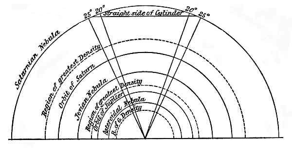 When we were attempting to describe in some measure the region of space from which the sun obtained the nebulous matter out of which it was formed, we found that it would produce a nebula somewhat resembling a most gigantic starfish, with arms or legs stretching out from it in every direction, which might be likened to mountain-peaks rising from a tableland or range of mountains; and when we began to condense the nebula we concluded that these peaks would very soon, comparatively, be left behind the main condensation, owing to their being more under the influence of the attraction of surrounding suns. And we might then have added less under the attraction of the main body, on account [320] of its gradually increasing distance arising from its greater rapidity of contraction. Now, we propose to return to these portions of the sun's property so long left out in the cold, to think of what in all probability became of them, seeing that they must all have had somehow a part of some kind to take in the formation of the solar system.