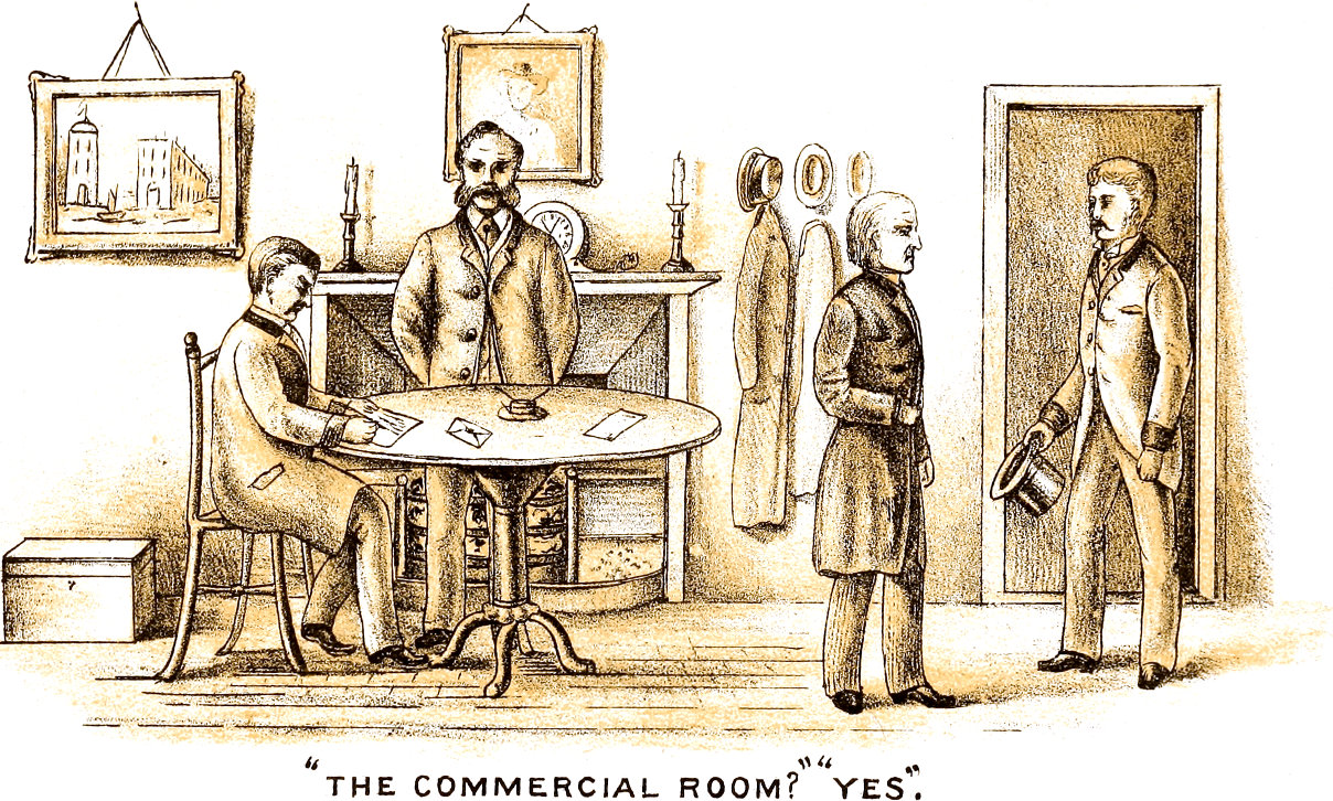 From the 1st May to the 1st September the pavement opposite to the coach-office was crowded by all the “hossy” gentlemen of the period. Guards and professionals might be seen busy with the coach-ladders, arranging their passengers, especially attentive to those attired in muslin, who seemed to require as much coupling and pairing as pigeons in a dovecot. Knots of gentlemen discussed the merits of this or that wheeler or leader, till, reminded by the White Horse clock that time was up, they took a cursory glance at their way-bills, and, mounting their boxes, stole away to the accompaniment of “a yard of tin.”