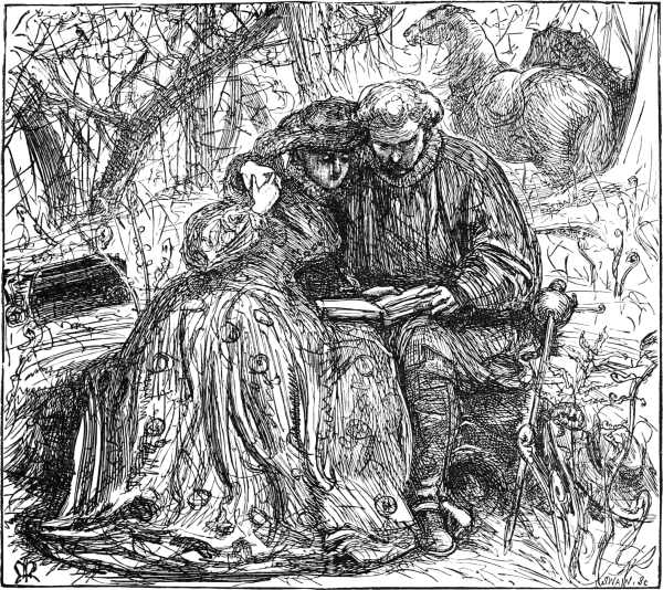 The number of Rossetti's book-illustrations is but ten in all, according to the list given in Mr. William Sharp's admirable monograph. To these one might perhaps add the frontispiece to that volume; as although the pen-drawing, A sonnet is a moment's monument, was never intended for reproduction, it forms a most decorative page. There is also a design for a frontispiece to the Early Italian Poets, which was first reproduced in the English Illustrated Magazine, No. 1. The actual frontispiece was etched but never used, and the exquisitely dainty version survives only in two impressions from the plate, both owned by Mr. Fairfax Murray. Another frontispiece, to The Risen Life,10 a poem by R. C. Jackson, in a cover designed by D. G. R. (R. Elkins and Co., 10 Castle St., East Oxford St., W., 1884), belongs to the same category, in which may be placed The Queen's Page, drawn in 1854, and reproduced in Flower Pieces by Allingham (Reeves & Turner, 1888). The ten which were all (I believe) drawn upon the wood include: Elfen-mere, published first in William Allingham's The Music-master, 1855, and afterwards reprinted in a later volume, Life and Phantasy, and again in Flower161 Pieces (1888), by the same author. This design 'revealed to young Burne-Jones' (so his biographer, Mr. Malcolm Bell, has recorded) that there existed a strange enchanting world beyond the hum-drum of this daily life—a world of radiant, many-coloured lights, of dim mysterious shadows, of harmonies of form and line, wherein to enter is to walk among the blest—that far-off world of Art into which many a time since he has made his way and brought back visions of delight to show his fellow-men. The first suspicion of that land of faëry came to him when, in a small volume of poems by William Allingham, he found a little wood-cut, 'Elfen-mere,' signed with a curious entwinement of the initials D. G. R. The slumbering spirit of fancy awoke to life within him and cast her spells upon him never to be shaken off.'