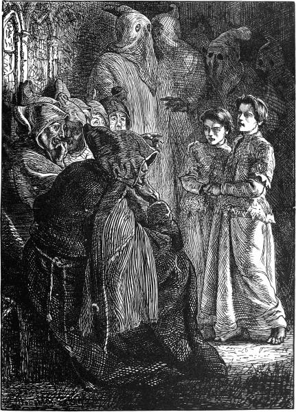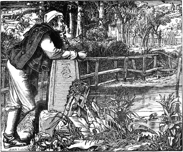 Sir John Everett Millais, Bart., P.R.A. (born June 8, 1829, died August 13, 1896).—As these proofs were being sent to press, the greatest illustrator of all (having regard to his place as the pioneer of the school which immediately succeeded the pre-Raphaelites, the number of his designs, and their superlative excellence), has joined the majority of his fellow-workers in the sixties. It would be impossible in a few lines to summarise his contributions to the 'black-and-white' of English art; that task will doubtless be undertaken adequately. But, if all the rest of the work of the period were157 lost, his contributions alone might justly support every word that has been or will be said in praise of 'the golden decade.' From the 1857 Tennyson to his latest illustration he added masterpiece to masterpiece, and, were his triumphant career as a painter completely ignored, might yet be ranked as a great master on the strength of these alone.