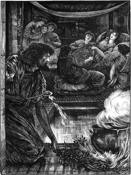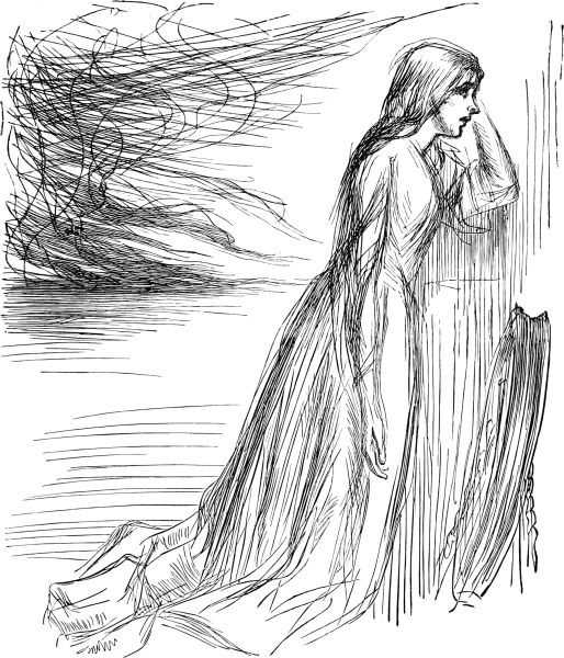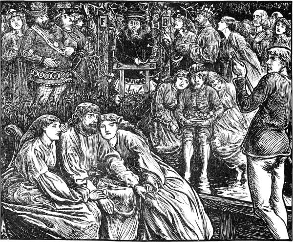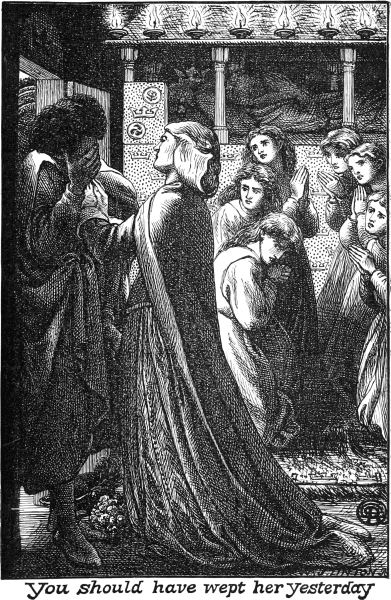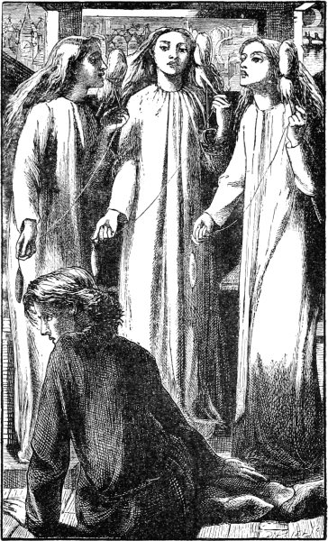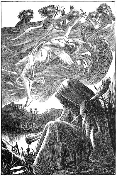 In the Oxford and Cambridge Magazine, 1856, Mr. Burne-Jones wrote of this very design: 'There is one more I cannot help noticing, a drawing of higher finish and pretension than the last, from the pencil of Rossetti, in Allingham's Day and Night Songs, just published. It is, I think, the most beautiful drawing for an illustration I have ever seen: the weird faces of the maids of Elfen-mere, the musical, timed movement of their arms together as they sing, the face of the man, above all, are such as only a great artist could conceive.'