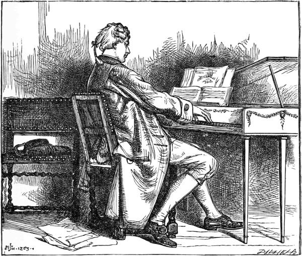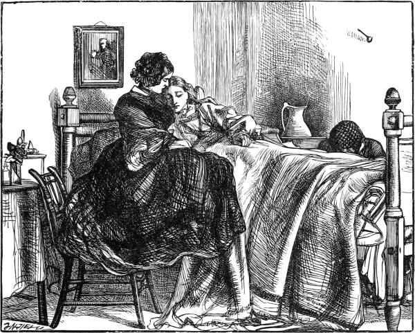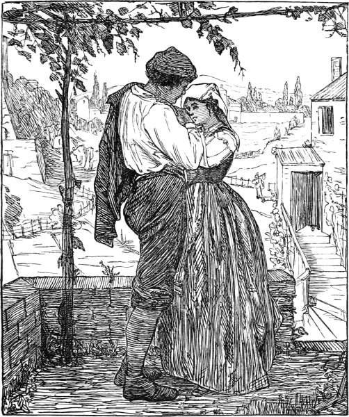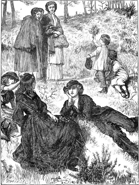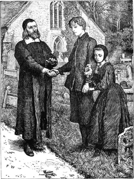 Frederick Walker13 (1840–1875), who was born in Marylebone on the 26th of May 1840, has been the subject of so many appreciations, and at least one admirable monograph, that a most brief notice of his career as an illustrator will suffice here. His father was a designer of jewelry and his grandfather had some skill in portrait-painting. How he began drawing from the Elgin marbles in the British Museum at the age of sixteen has been told often enough. Many boys of sixteen have done the same, but it is open to doubt if any one of them has absorbed the spirit of their models so completely as Fred Walker did. It would be hardly asserting too much to say for him that they replaced humanity, and that his male figures seem nearly always youths from the Parthenon in peasant costume. At seventeen or eighteen he was working at Leigh's life-class in Newman Street, and at the same time was employed in Mr. Whymper's wood-engraving establishment. His first appearance in Everybody's Journal is duly noted elsewhere, also his first drawing in Once a Week; but the peculiar affection he had inspired by his work has kept most of his critics from saying that some of his earliest designs, as we know them after engraving, appear distinctly poor. But, from the time he ceased to act as 'ghost' for Thackeray, and signed his work with the familiar F. W., his career shows a distinct and sustained advance until the ill-fated 1875, in which George Mason, G. J. Pinwell, and A. Boyd Houghton also died.
