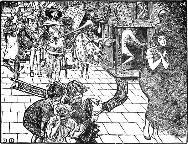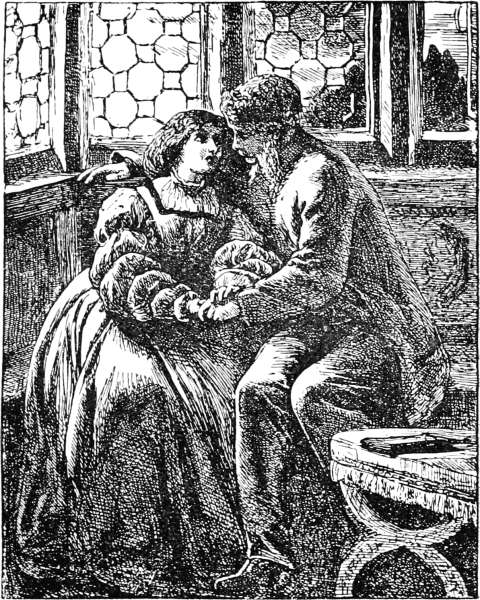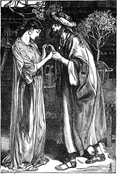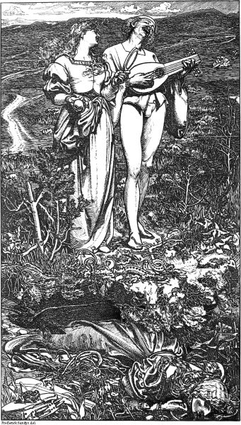 The mass of work accomplished in illustration alone, between his first appearance and his death in 1875, is amazing. There is scarce a periodical of any rank which has not at least one example from his pen. The curt attention given here to the man must be pardoned, as reference to his work is made on almost every page of this book. For an appreciative essay, that is a model of its class, one has but to turn to Mr. Laurence Housman's volume12 which contains also five original drawings on wood (reproduced in photogravure) and eighty-three others from Dalziel's Arabian Nights (Ward, Lock & Co., 1863-16565 and Warne, 1866), Don Quixote, the two volumes of Mr. Robert Buchanan's Poems—Ballad Stories of the Affections (1866), and North Coast (1868), Home Thoughts (1865), National Nursery Rhymes (1871), and The Graphic (1870).