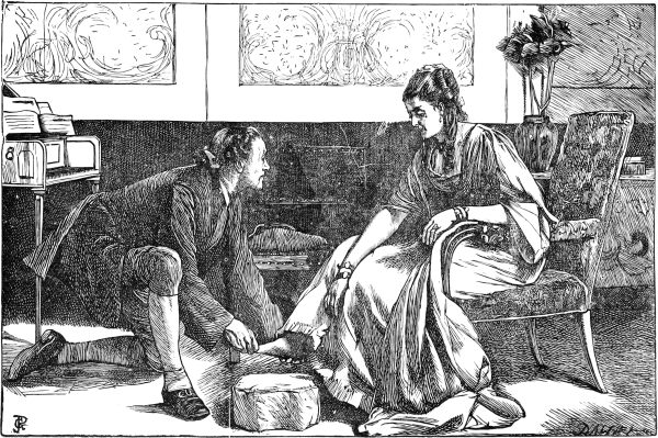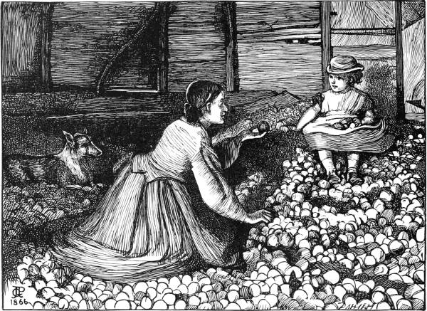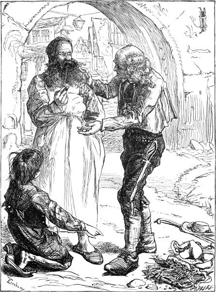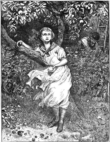 George John Pinwell (1842–1875).—This notable illustrator, whose work bulks so largely in the latter half of the sixties, was born December 26, 1842, and died September 8, 1875. He studied at the Newman Street Academy, entering in 1862. At first his illustrations show little promise; some of the earliest, in Lilliput Levée, a book of delightful rhymes for children, by Matthew Browne, are singularly devoid of interest. No engraver's name appears on them, nor is it quite clear by what process they were reproduced. They are inserted plates, and, under a strong magnifying glass, the lines suggest lithography. The unfamiliar medium, supposing they were drawn in lithographic ink, or by graphotype, or some similar process, would account for the entire absence of the qualities that might have been expected. Some others, in Hacco the Dwarf and in The Happy Home, the latter in crude colours, are hardly more interesting.