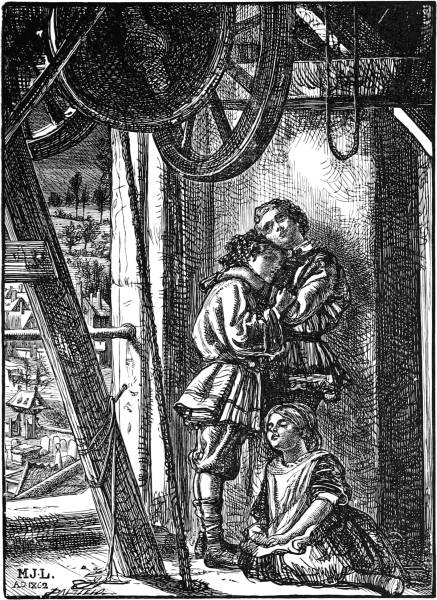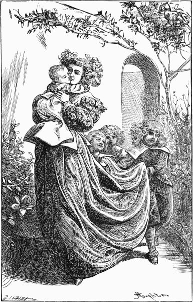 Good Words in 1869 contains two drawings to Carmina Nuptialia, and The Sunday Magazine the same year has a very beautiful composition, Blessings in Disguise. In 1870–1871 Good Words for the Young includes, in the first two volumes, no less than seventy-six illustrations by Mr. Hughes to At the Back of the North Wind, fourteen to The Boy in Grey, thirty to Ranald Bannerman's Boyhood, thirty to The Princess and Goblin, ten to Lilliput Revels, six to Lilliput Lectures, and two to King Arthur, besides one each to Fancy, The Mariner's Cave, and a notable design to The Wind and the Moon. In 1871 also belongs My Lady Wind (p. 38), Little Tommy Tucker (p. 46), in Novello's National Nursery Rhymes.
