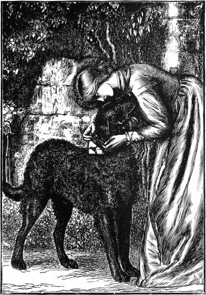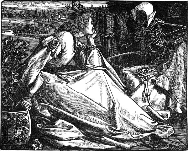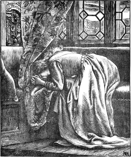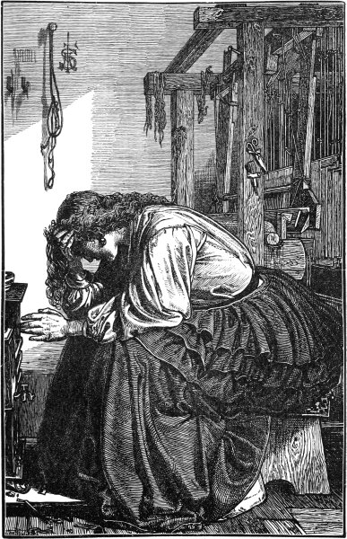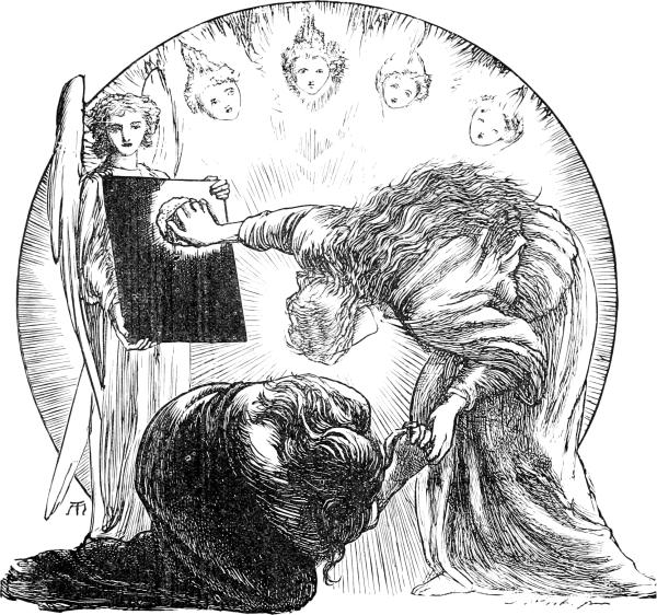 'The Tennyson designs, which were engraved on wood and published in the Illustrated Tennyson, in which Millais, Hunt, Mulready, and others co-operated,' says Mr. William Michael Rossetti, 'have in159 the long run done not a little to sustain my brother's reputation with the public. At the time they gave him endless trouble and small satisfaction. Not indeed that the invention or the mere designing of these works was troublesome to him. He took great pains with them, but, as what he wrought at was always something which informed and glowed in his mind, he was not more tribulated by these than by other drawings. It must be said, also, that himself only, and not Tennyson, was his guide. He drew just what he chose, taking from his author's text nothing more than a hint and an opportunity. The trouble came in with the engraver and the publisher. With some of the doings of the engraver, Dalziel (not Linton, whom he found much more conformable to his notion), he was grievously disappointed. He probably exasperated Dalziel, and Dalziel certainly exasperated him. Blocks were re-worked upon and proofs sent back with vigour. The publisher, Mr. Moxon, was a still severer affliction. He called and he wrote. Rossetti was not always up to time, though he tried his best to be so. In other instances he was up to time, but his engraver was not up to his mark. I believe that poor Moxon suffered much, and that soon afterwards he died; but I do not lay any real blame on my brother, who worked strenuously and well. As to our great poet Tennyson, who also ought to have counted for something in the whole affair, I gather that he really liked Rossetti's designs when he saw them, and he was not without a perceptible liking and regard for Rossetti himself, so far as he knew him (they had first met at Mr. Patmore's house in December 1849); but the illustration to St. Cecilia puzzled him not a little, and he had to give up the problem of what it had to do with his work.'9