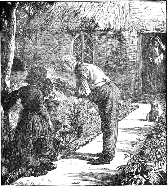Arthur Hughes was born in London in 1832, and became a pupil of Soames of the Royal Academy Schools, exhibiting for the first time at the annual exhibition in 1854. In 1855 appeared, as we have just seen, The Music-master. The artist seems to have worked fitfully at illustrations, but his honourable labours in painting dispose of any charge of indolence, and, did but the scope of this work permit it, a still more interesting record of his artistic career could be made by including a list of pictures exhibited at the Royal Academy, the Institute, the Grosvenor, the New Gallery, and elsewhere. Between 1855 and 1861 I have found no illustrations, nor does he himself recall any. In the latter year there are two designs in The Queen to poems by George Mac Donald and F. Greenwood. The next magazine illustration in order is At the Sepulchre in Good Words, 1864. In 1866 appeared an edition of Tennyson's Enoch Arden, with twenty-five illustrations by Arthur Hughes.' This noteworthy book is one of the essential volumes to those who make ever so small a collection of the books of the sixties. Although the work is unequal, it contains some of his most delightful drawings. In the same year London Society contained The Farewell Salutation. In 1867 George Mac Donald's Dealings with the Fairies was published. This dainty little book, which contains some very typical work, is exceptionally scarce. Another book which was published in 1868 is now very difficult to run across in its first edition, Five Days' Entertainment at Wentworth Grange, by F. T. Palgrave, illustrated with seventeen designs, the woodcuts (sic) being by J. Cooper, and a vignette engraved on steel by C. H. Jeens.