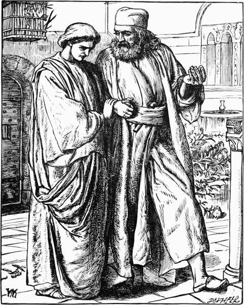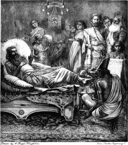 Arthur Boyd Houghton (1836–1875) was born in 1836, the fourth son of his father, who was a captain in the Royal Navy. He visited India, according to some of his biographers; others say that he was never in the East, but that it was a brother who supplied him with the oriental details that appear in so many of his drawings. Be that as it may, his fellow-workers on the Arabian Nights pretended to be jealous of his Egyptian experience, and declared that it was no good trying to rival from their imaginings the scenes that he knew by heart.164 At present, when all men unite to praise him, it would almost lend colour to a belief that he was unappreciated by his fellows to read in a contemporary criticism: 'His designs were often striking in their effects of black and white, but were wanting in tone and gradation—a defect partly due to the loss of one eye.' This is only quoted by way of encouragement to living illustrators, who forget that their hero, despite sympathy and commissions, suffered also much the same misunderstanding that is often their lot. Against this may be set a criticism of yesterday, which runs:—