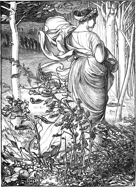 Between Walker and Pinwell a friendship sprang up, but it seems to have been Thomas White who introduced the former to Once a Week, wherein his first contribution, The Saturnalia, was published, January 31, 1863. In 1864 he began to work for Messrs. Dalziel on the Arabian Nights and the Illustrated Goldsmith, which latter is his most important volume. In 1869 he became a member of the Old Water Colour Society, but his work as a colourist does not concern us here. Nor is it necessary to recapitulate the enormous quantity of his designs which in magazines and books are noticed elsewhere in these pages. Some illustrations to Jean Ingelow's Poems, notably seven to The High Tide, represent his best period. But he suffered terribly by translation at the engravers' hands. The immobility, which characterises so many of his figures, does not appear in the few drawings which survive. Mr. Pennell is the fortunate possessor of several of the designs for The High Tide; but the pleasure of studying these originals is changed to pain when one remembers how many others were cut away by the engraver. It is curious that three men, so intimately associated as Walker, Pinwell, and Houghton, should have preserved their individuality so entirely. It is impossible to confuse the work of any of them. Walker infused a grace into the commonplace which, so far as the engravings are concerned, sometimes escaped Pinwell's far more imaginative creations; while Houghton lived in a world of his own, wherein all animate and inanimate objects obeyed the lines, the swirling curves, he delighted in. If, as has been well said, Walker was a Greek—but a dull Greek—then Pinwell may be called a Naturalist with a touch of realism in his technique, while Houghton was romantic to the core in essence and manipulation alike.