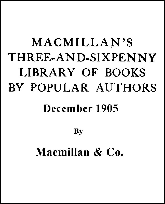 The Project Gutenberg EBook of Macmillan's Three-and-Sixpenny Library of Books by Popular Authors December 1905, by Various This eBook is for the use of anyone anywhere at no cost and with almost no restrictions whatsoever. You may copy it, give it away or re-use it under the terms of the Project Gutenberg License included with this eBook or online at www.gutenberg.org Title: Macmillan's Three-and-Sixpenny Library of Books by Popular Authors December 1905 Author: Various Release Date: April 28, 2014 [EBook #45516] Language: English Character set encoding: ISO-8859-1 *** START OF THIS PROJECT GUTENBERG EBOOK MACMILLAN'S THREE-AND-SIXPENNY LIBRARY *** Produced by sp1nd, Diane Monico, and the Online Distributed Proofreading Team at http://www.pgdp.net (This file was produced from images generously made available by The Internet Archive)