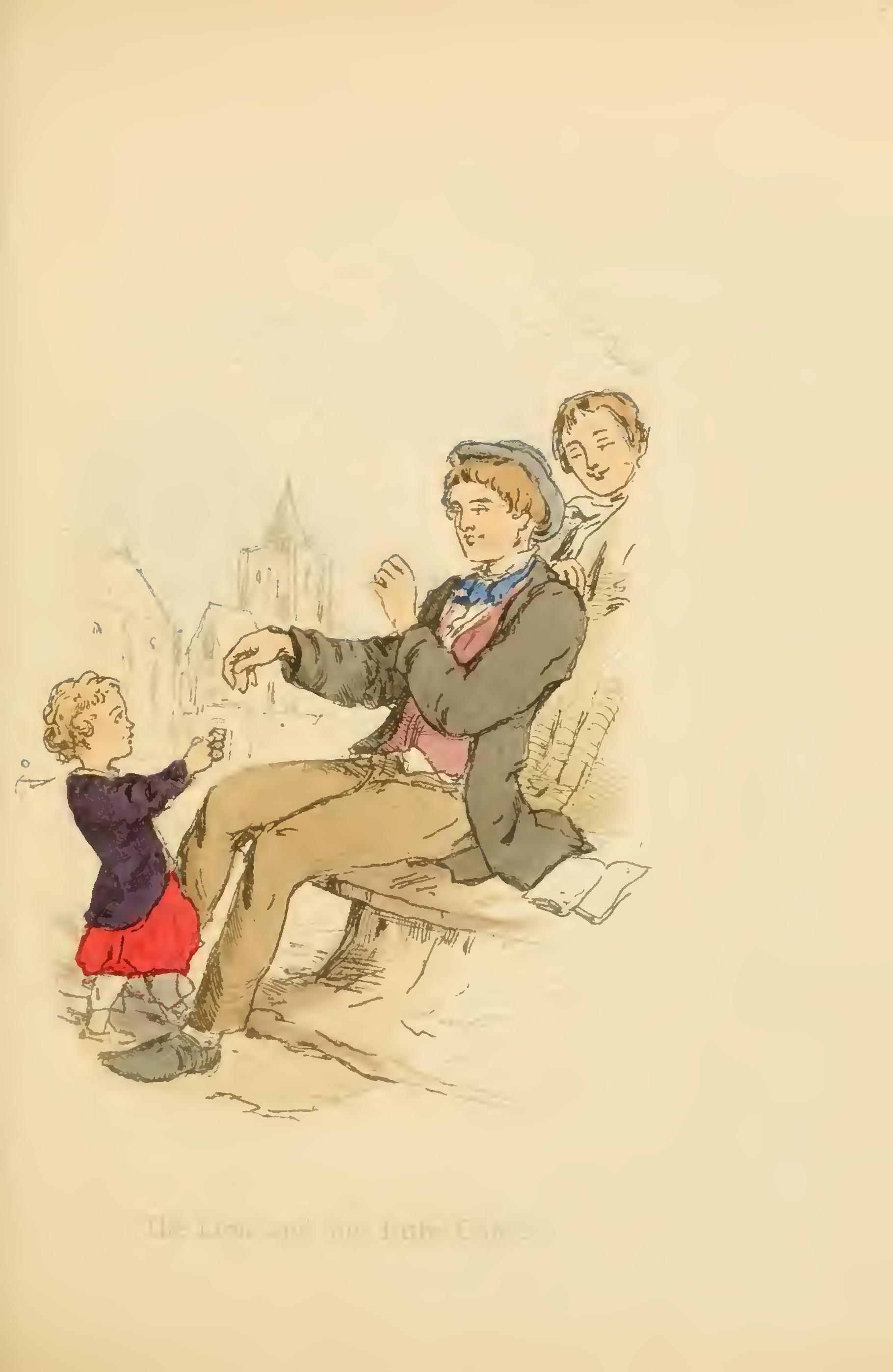 Though she is kind to all, it must be owned she shows the most gross favouritism towards the amiable children. She brings them cakes from dessert, and regales them with Zoe's preserves; spends many of her little shillings in presents for her favourites, and will tell them stories by the hour. She has one very sad story about a little boy, who died long ago; the younger children are never weary of hearing about him; and Miss Raby has shown to one of them a lock of the little chap's hair, which she keeps in her work-box to this day.