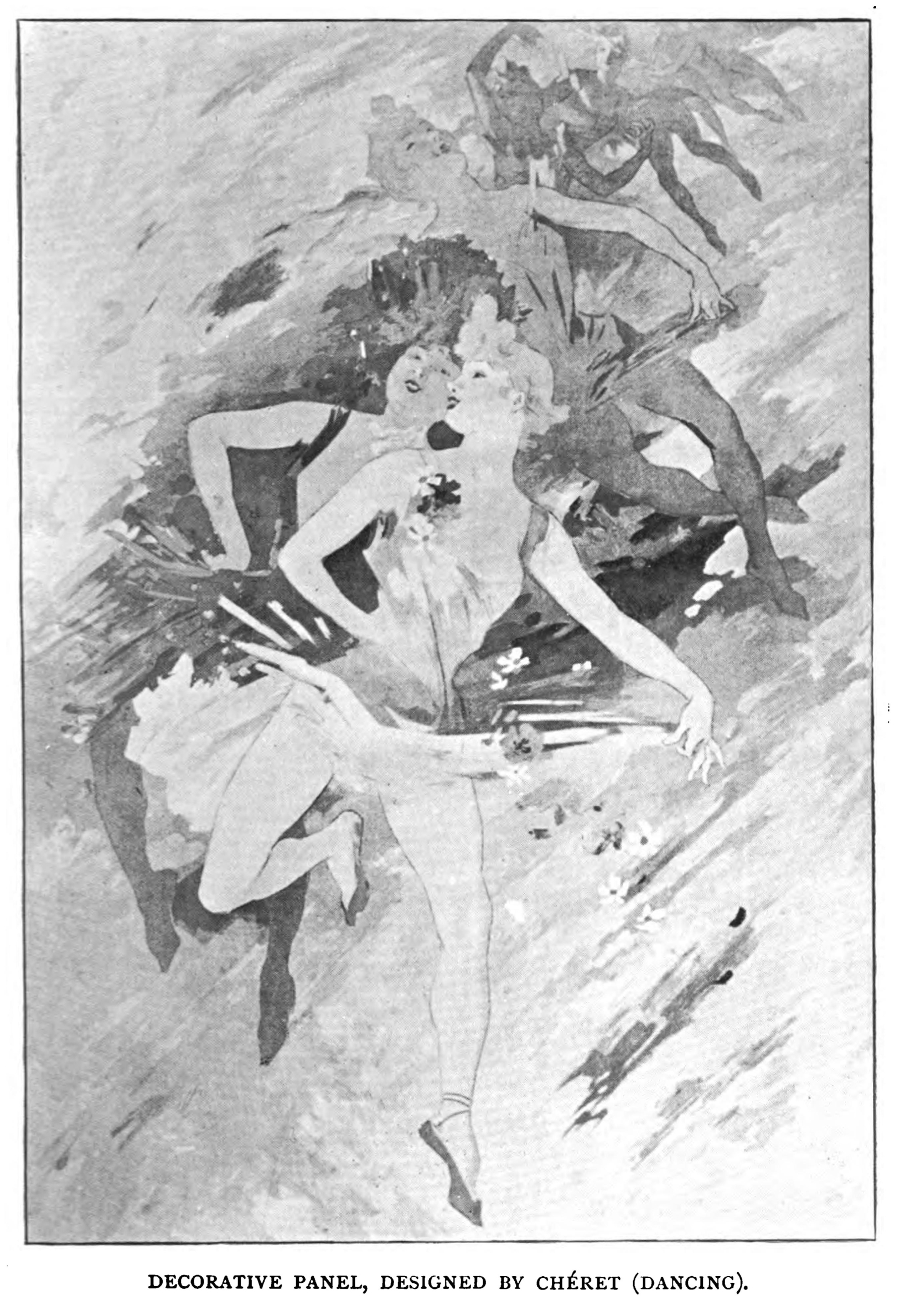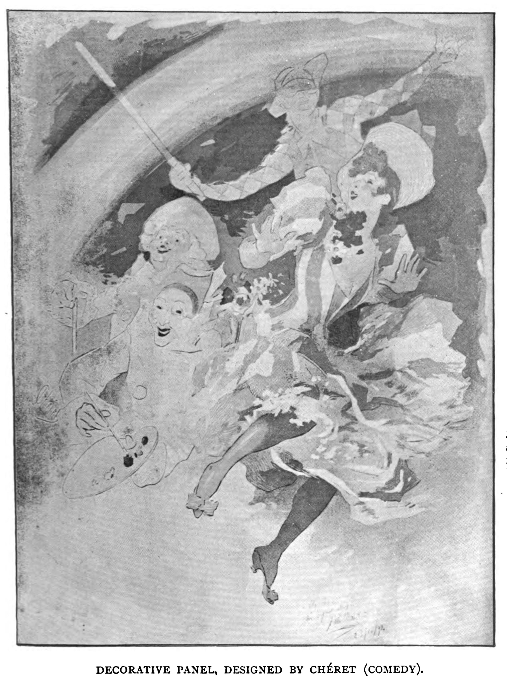 As may be imagined, Chéret's skill has fullest scope when dealing with the lightest and gayest subjects: a cascade de clowns—to borrow a phrase of Huysman—an entrance of ballet girls; a joyous troupe of children, contented because toy-laden; these, and the like, are subjects most congenial to him. His style is essentially the outcome of the day. It possesses no decorative forerunners; it is not a thing derived; its parents are the gaieties of modern Paris. It is intensely actual, and in its actuality lies, it