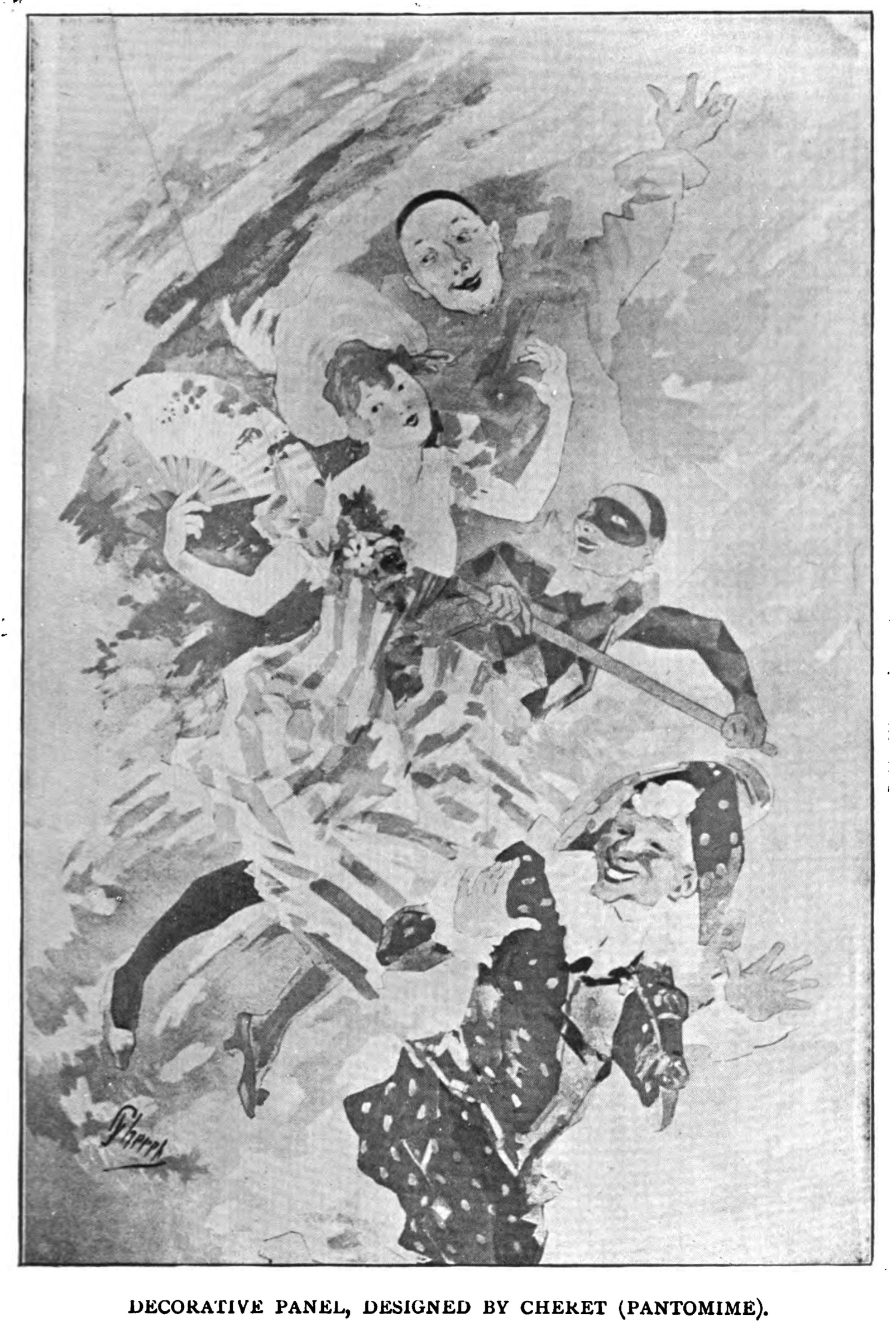 To attempt any account of Chéret's thousand and more posters, is obviously impossible in any but an elaborate monograph devoted exclusively to him. I can do no more here than comment on a few of the most striking. It may be stated generally, that while the earlier ones are rarest because most difficult to procure, the more recent designs show the artist at his best. A mastery of chromo-lithography such as his, cannot be obtained without many essays, some of which are foredoomed to failure. In addition, Chéret has gradually improved alike in the splendour of his colour, and the disposal of his pattern. Perhaps he has never been happier in his treatment of children than in one or two of the "Buttes-Chaumont" series. The joy of the little ones in the possession of their new playthings is contagious. Utterly different in kind, though not less conspicuously successful, is "Les Coulisses de l'Opéra au Musée Grevin," a delightfully piquant representation of a group of premières danseuses in the traditional costume. As a specimen of amazingly effective and strangely beautiful colour, it would be difficult to exceed the "Loie Fuller" series; while, in the matter of pert gracefulness, Chéret has done nothing more delicious than the chic little lady in the yellow dress who smiles at you in the "Pantomimes Lumineuses." Anybody who could resist her fascinations would be a rival to St. Anthony. No collector of course, will overlook the great series of affiches which Chéret has contrived for the Folies Bergère, the Moulin Rouge, the Alcazar d'Eté, and similar places of amusement In order to sum up his talent as a designer of posters, Chéret has produced four decorative panels, which, although without lettering,